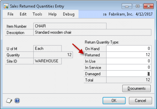 2. As defined in the ACME requirements, the Sale Return Account will only be updated if a user enters a Quantity into the “Returned” Quantity Type as noted by the red arrow below.