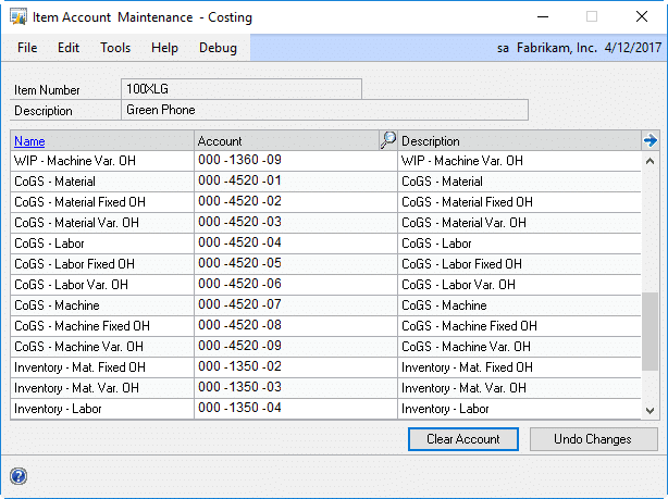 ACME will enter COGS accounts on the Item Account Maintenance- Costing window. The COGS Allocation described in the next section will only reallocate costs that have a matching GP Account in this window. For example, if only COGS-Material is present, the material cost from manufacturing will be subtracted from the IV COGS distribution and allocated to the COGS-Material account. Labor, Overhead, and any other costs will remain the in the IV COGS account.