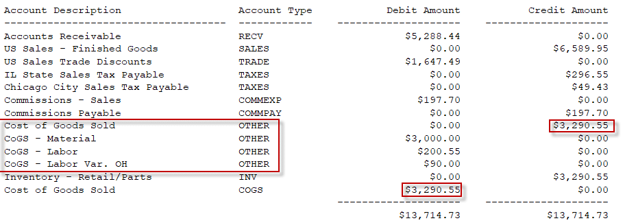 During Sale Invoice Posting, additional posting accounts and distributions will be added to the transaction to reallocate the COGS amount into the individual cost buckets recorded on the Manufacturing Order.