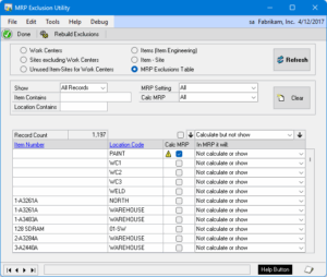 * NEW! MRP Exclusion Utility: Replaces the MRP Exclusion List window with one that is much easier to use. Our new MRP Exclusion Utility pulls together all the sources of MRP Settings (Item Engineering, Site Resource Planning, Item Resource Planning) together with the MRP Exclusions table so you can see and fix everything in one place. Quickly identify why something is not appearing in MRP.