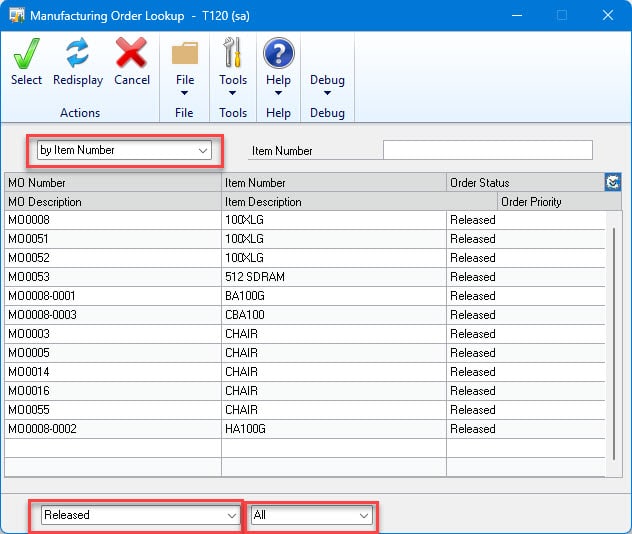 The new MO Lookup tweak saves the dropdown box settings on the Manufacturing Order Lookup window and re-applies them the next time the window is opened.