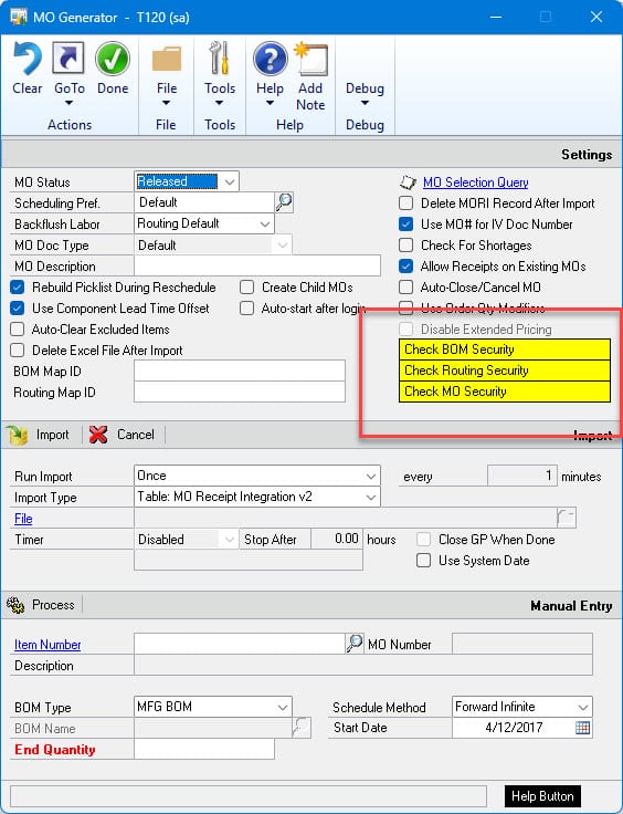 * MOGen: added manufacturing security checks for BOM locks, Routing locks, and MO locks. New ‘highlight’ fields on the window will draw attention to locked records and provide a direct link to the related Security window (BOM Security, Routing Security, MO Security). Locks records can prevent MOGen from processing if a record it needs is locked. (#202501163)