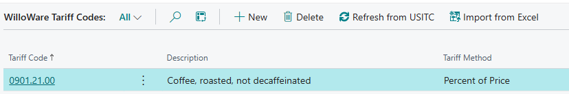 To enter a new Tariff Code, click the NEW button to open the WilloWare Tariff Code card.