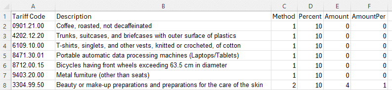- Column 3: Tariff Method (0 = % Unit Cost, 1 = % Unit Price)
