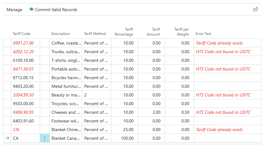 IMPORT FROM EXCEL – Tariff codes can be imported into Business Central from an Excel file. The required layout is shown below. The import will begin on row 2.