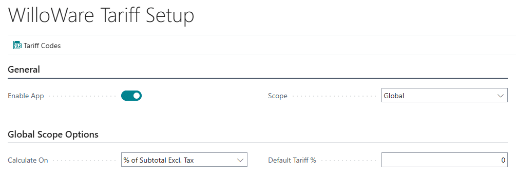 DETAILED – Uses the settings from the Detailed Scope Options section only to calculate a tariff surcharge on every sales document. Specific Tariff Codes can be setup and assigned to sales items using the Tariff Codes button, or searching for ‘WilloWare Tariff Codes’.