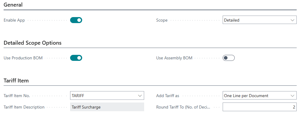 GLOBAL – Uses the settings from the Global Scope Options section to calculate a tariff surcharge on every sales document. When using the global scope, individual tariff (or HTS) codes are not recorded nor used in the calculation of tariffs.