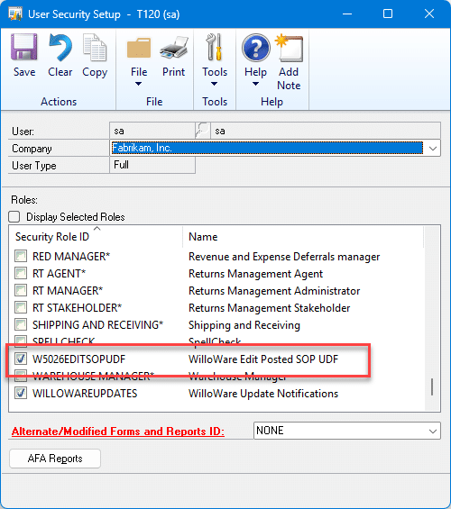 Enabling the Tweak creates a role called W5026EDITSOPUDF. Assign the role to users to give them permission to edit the information on posted transactions.