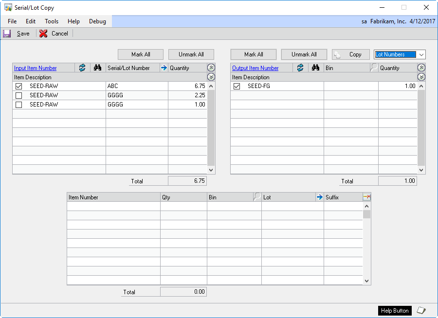 The outputs side fills with the Output Items that are serial or lot controlled. Mark the outputs to copy Lot/Serial number TO, and if needed, enter a bin.