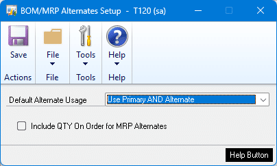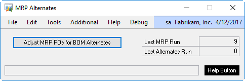 The MRP Alternates enhancement adjusts MRP’s Suggested PO’s if there is quantity available of USE UP Items. The utility will run automatically if MRP is run from inside GP, but if MRP is run via a SQL Job you will need to manually run the MRP Alternates utility after MRP runs.