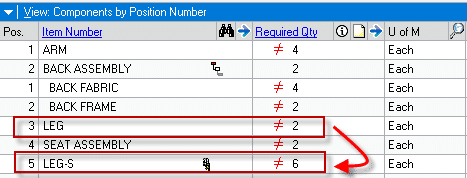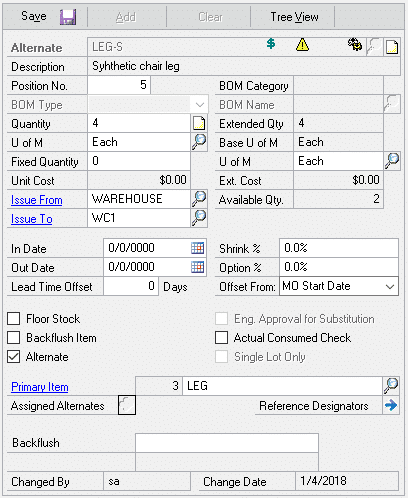 Setup for a Primary-Use Up relationship is shown above. LEG-S (Synthetic Leg) is replacing LEG (Wood Leg), however LEG should be used until it is gone from inventory. NOTE: the “Use Up” item and the “Primary” item must be equivalent in quantity and Unit of Measure. For example, both items are types of “leg” used on a chair, and both are used 4 per chair. The software will swap quantities as needed to use up the old item. Staying with the chair example, this could result in a chair that has three wood legs and one synthetic leg.