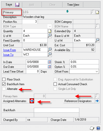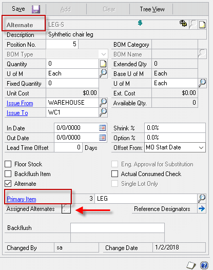 When viewing a Primary Item (right image), the field label for “Component” is changed to PRIMARY, the “Alternate For” label is changed to PRIMARY ITEM and the field is locked, and the “Assigned Alternates” expansion button enabled and turned RED.