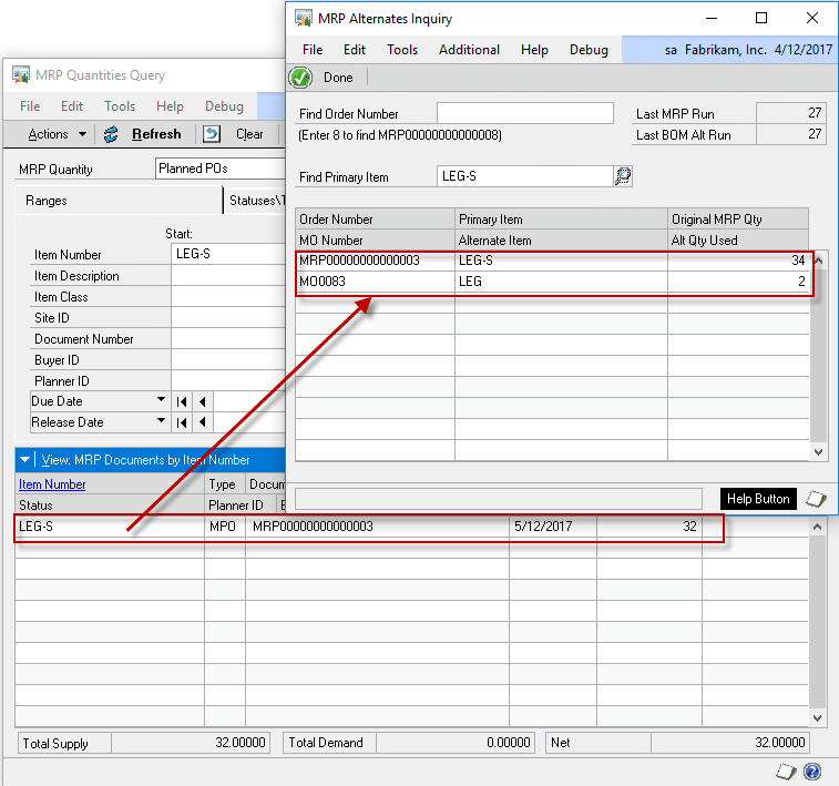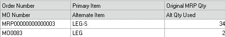 When the MPO is viewed in the MRP Alternates Inquiry window, it becomes apparent that the original quantity of 34 would meet the shortage, but that shortage should now be met by using LEG instead of LEG-S.