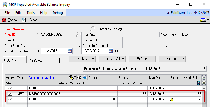 Reducing MRP suggestions to account for consumption of Use Up Items can cause some of the MRP windows to show confusing values. For example, as shown above, since MRP Alternates reduced the Suggested PO by 2, the MRP Projected Available Balance window shows a shortage.