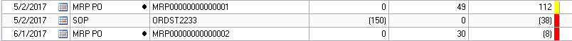 INV SS = Safety Stock IV Trx = Inventory Transaction or Transfer Mfg MO = Manufacturing Order Mfg PL = Manufacturing Picklist MRP Cancel = MRP Suggested Cancel MRP Move In = MRP Suggested Move In MRP Move Out = MRP Suggested Move Out MRP MO = MRP suggested MO MRP PL = MRP MO Picklist MRP PO = MRP suggested PO POP = Purchase Order SOP = Sales Transaction SVC = Service Call or Work Order parts requirement SVC Trf = Intransit Transfer Unmet Fcst = Manufacturing Unmet Sales Forecast As shown below, the MRP lines will have a Black Dot to highlight that they are from MRP and represent Planned supply or demand vs. actual. |