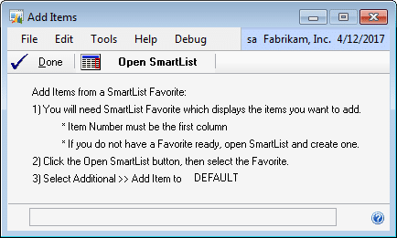 Click Open SmartList. When SmartList is opened from the Add Items window, an Additional Menu item will be added to the SmartList window, such as “Add Items to DEFAULT”.
