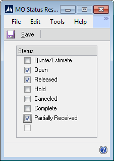 - MFG Status: mark to only include MOs that have a specified status. Click the expansion button to open the MO Status Restrictions window (below). Mark which Status(es) should be included.