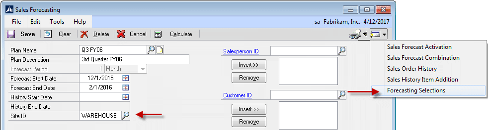 Lookup the Forecast in the Sales Forecasting window. It must be assigned a Site ID. Click the GoTo Button and select Forecasting Selections.